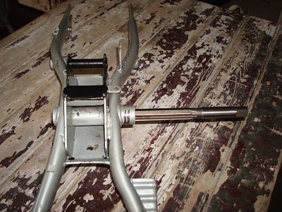 Ce w end, je me suis attelé au remontage du bras oscillant. Les silents block a la presse, les bagues d'axe de pédalier avec une tige filetée, rondelles et écrous de chaque coté et le tour est joué en serrant tranquilou…