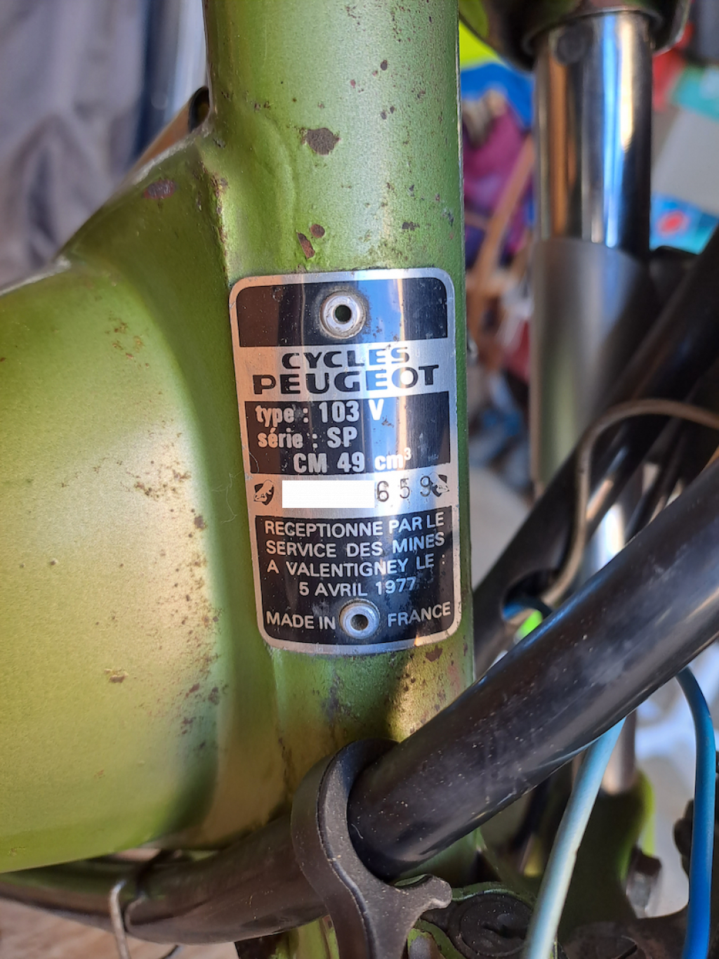 pour la peinture, ça doit etre celle ci : Peugeot 103 SP VERT métal 1er génération (sprido-peinture.com)