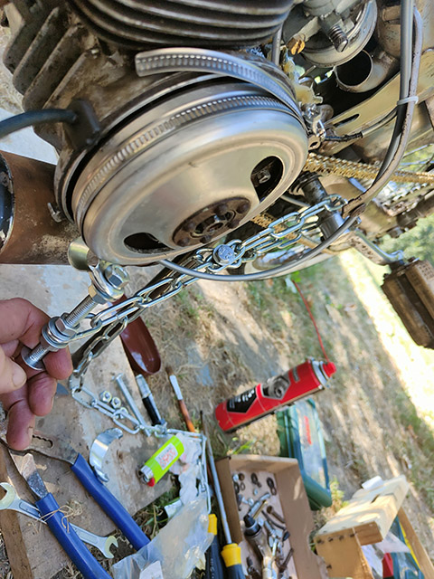 Puis desserrage du boulon assez facile, clé bien enfoncé, petite rallonge qui va bien, mise en tension délicate et petits coup de massette adaptés.