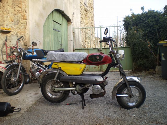 Je viens donner quelques nouvelles de mes vieilles .Ma GT 10 se porte très bien , elle a enfin trouvé des sigles de réservoir (que j'avais en stock) un cache volant moteur neuf d'époque ainsi qu'une selle d'époque aussi (merci a fournier) .