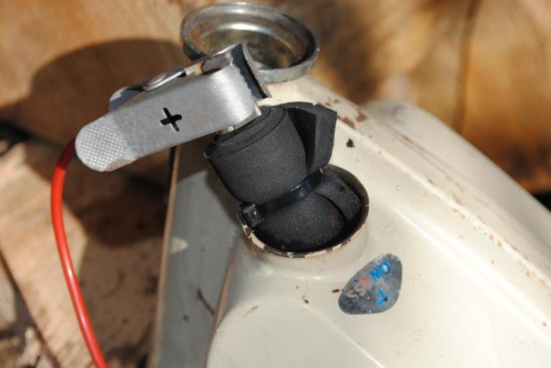 reliez le plus au morceau d inox plongez le dans le seau en plastique avec la soude et plongez votre piece en acier reliée au moins ( il ne faut pas que la piece touche le morceau inox )