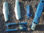 3) Atelier peinture : deux couches d’apprêts blanc ou gris selon la bombe que j'avais et puis plusieurs couches de peinture bleu ou blanche selon les pièces puis une couche de vernis brillant. La peinture à la bombe c'est toute une histoire ! Pas toujours une couleur ou un débit régulier, au début on fait des coulées, après le vernis fais des croutes, pfffffff. Mais à la fin on gère et ça va tout seul