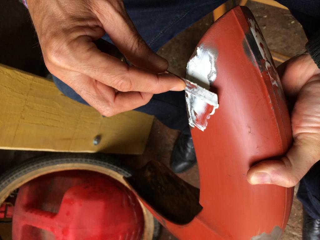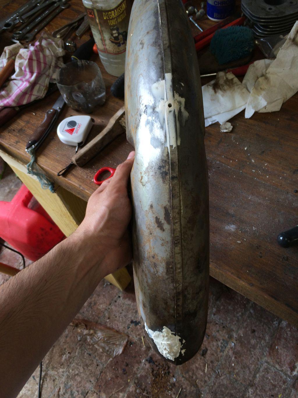 Une fois toutes les pièces nettoyées je me permet de les réparer avec du mastic sintofer pour reboucher les trous bouffés par le temps avec la rouille et remettre à droit les bosses :