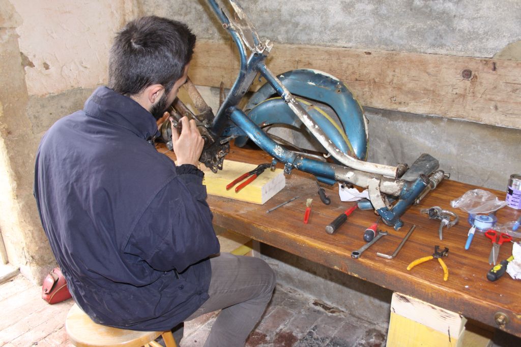 La suite viendra avec la réalisation d'un "dessus de selle" en métal fait à la masse et à l'enclume pour consolider la mienne qui est en miettes, le nettoyage du moteur à l'essence et à la brosse à dent et sa repeinte avec une bombe de peinture de galvanisation à froid brillante résistant à plus de 650°C.