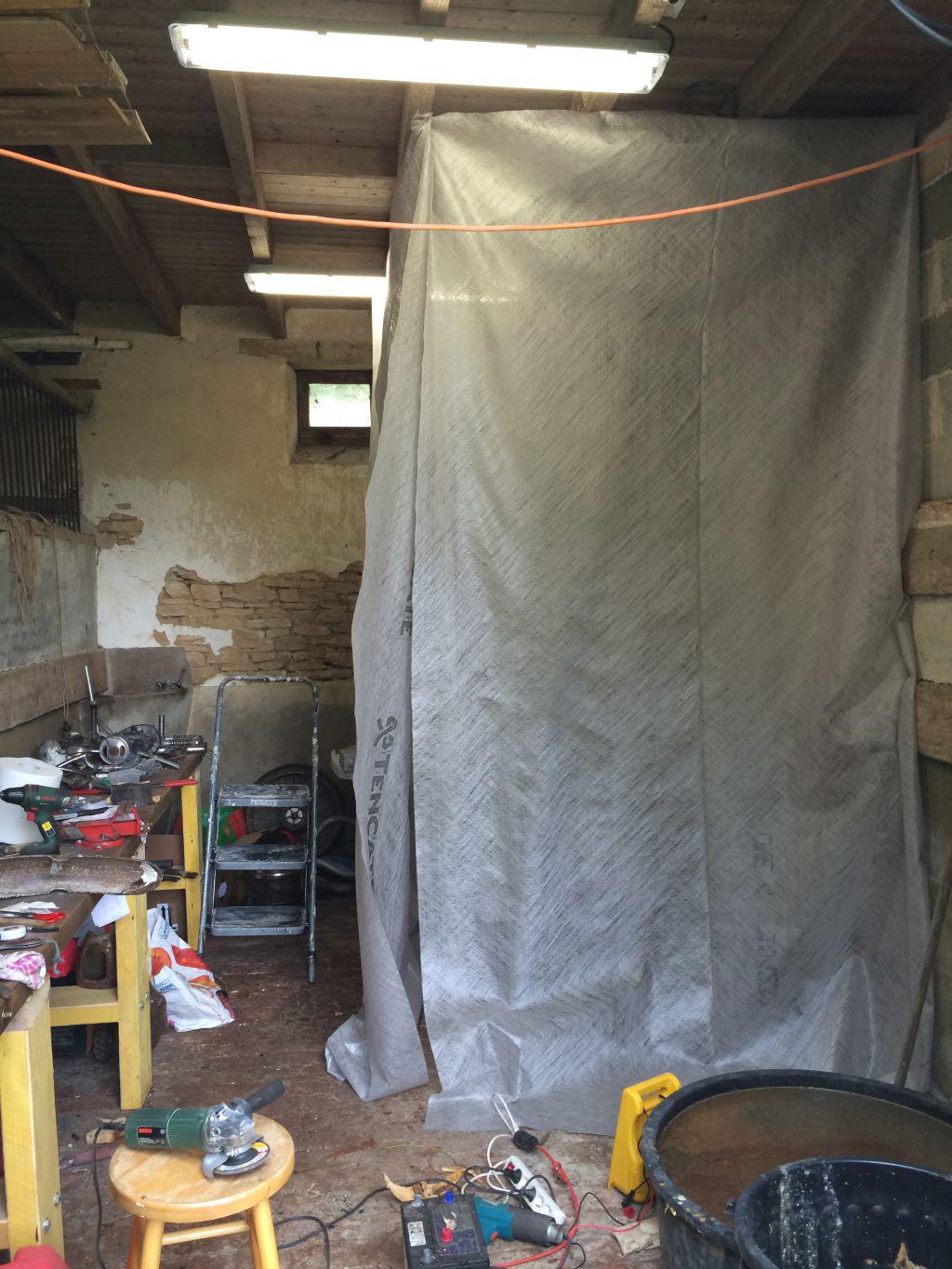 Dans l'objectif de tout repeindre, je me crée une cabine de peinture de piètre qualité et provisoire :