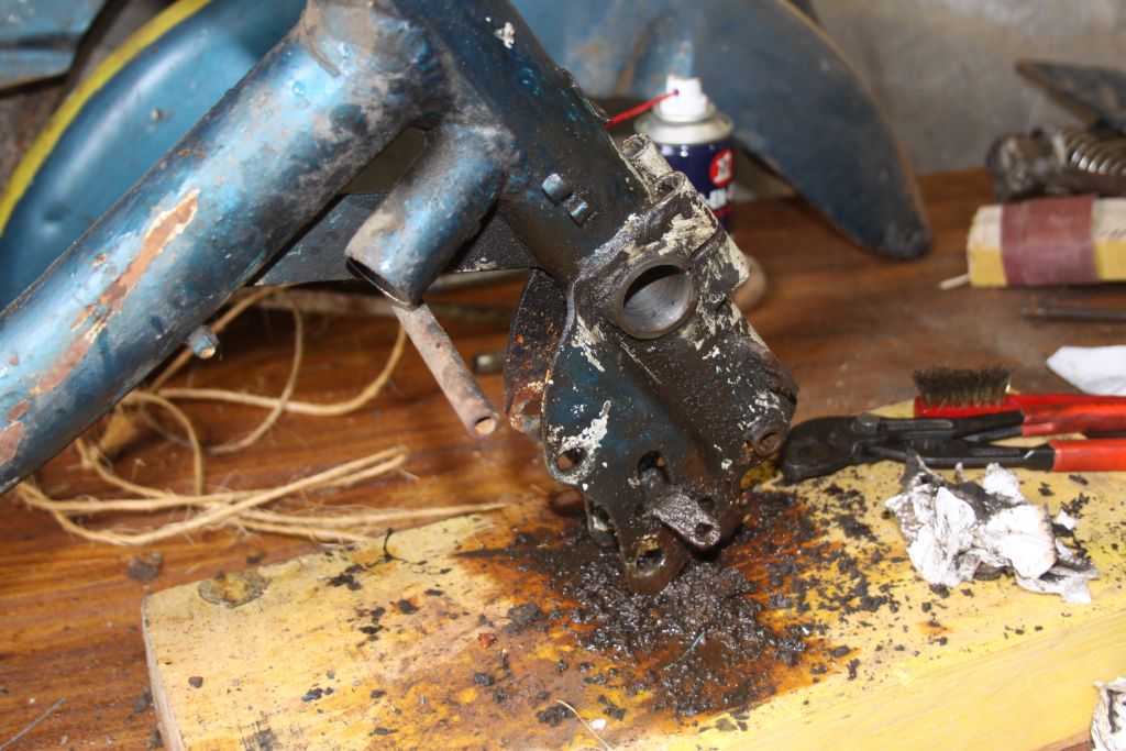 Il m'a expliqué que son vieux n'avait jamais eu le temps de la retaper et je veux bien le croire car le compteur ne me semble pas trafiqué vu le jaunissement des chiffres, le carbu est celui d'origine, la peinture était mal bricolée, des axes au démontage n'étaient pas d'origines et le réservoir était plein d'huile pour éviter qu'il ne rouille.