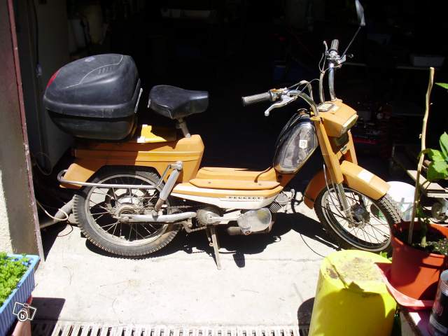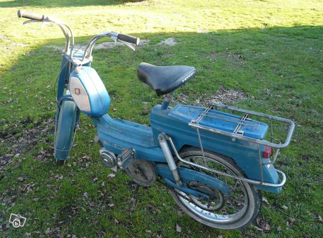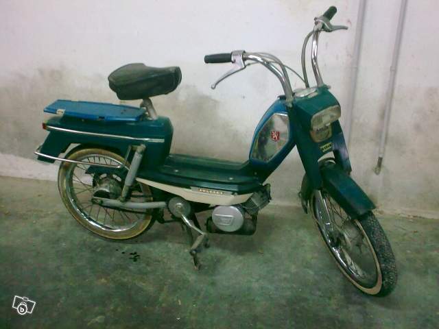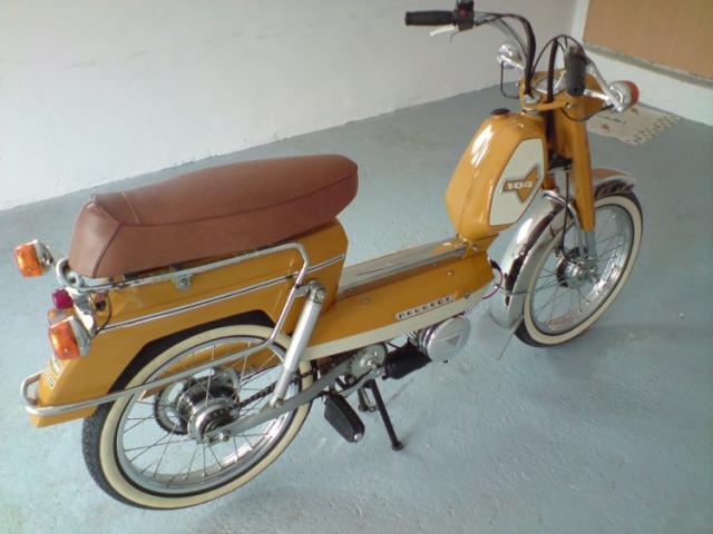 Le 104 Plus récent, avec garde boue chromé, décor du réservoir blanc. porte-bagage tubulaire chromé de série. La fourche est plus légère esthétiquement et le klaxon se cache derrière une grille en inox.