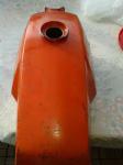 La bonne couleur d'origine, c'est le orange qui apparait sous la peinture rouge foncée de ton réservoir de TSA. Celui-là, il a du être repeint au pinceau et au sang de boeuf.....