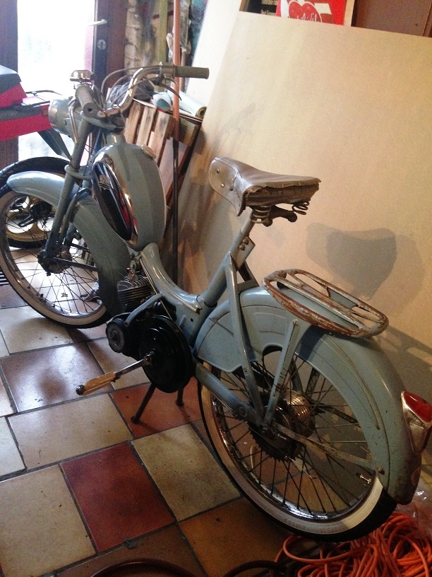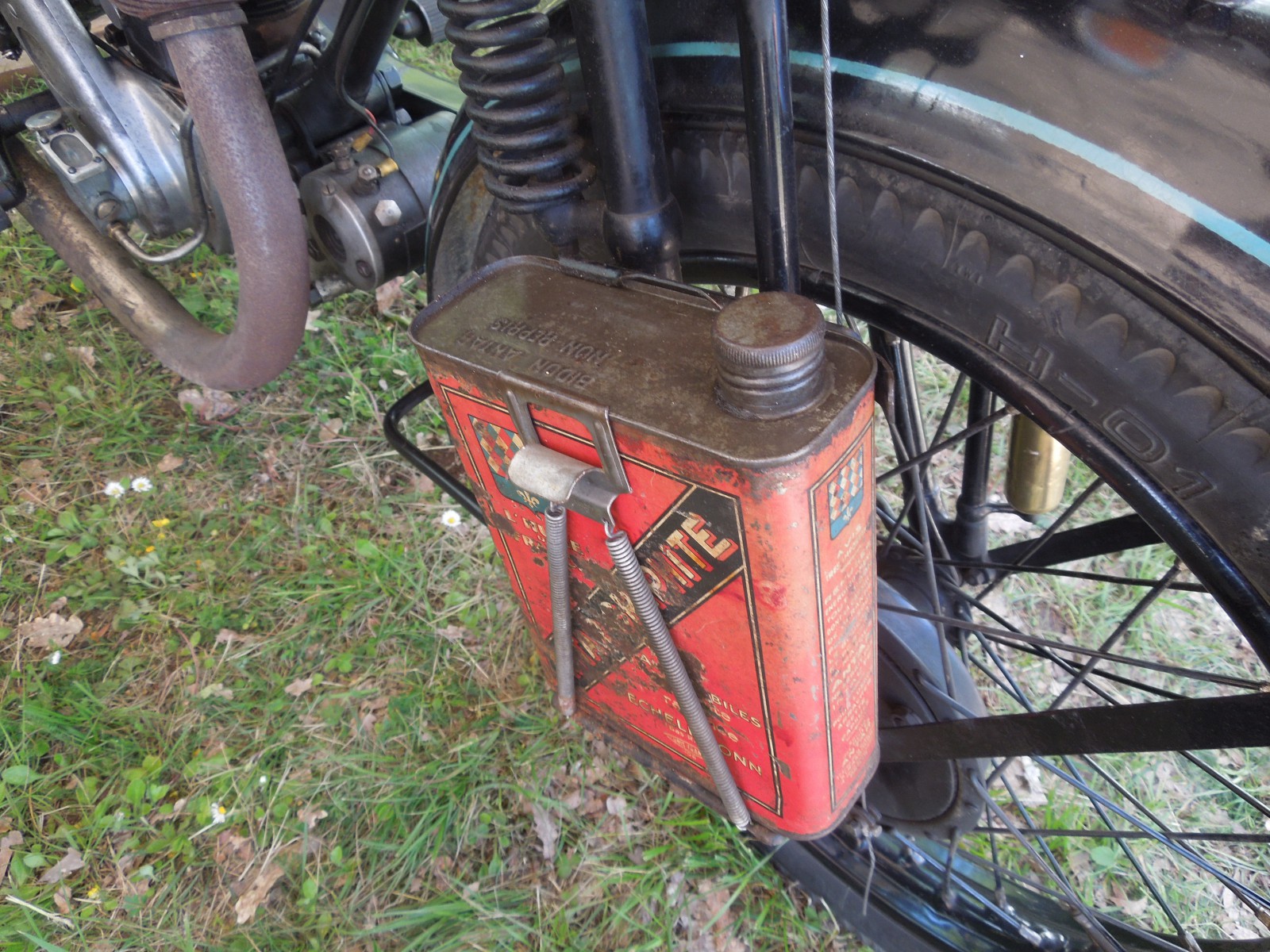 Merci pour les photos. Au programme du jour, montage des pneus à flanc blanc, remise en place du moteur et test de l'allumage avec une nouvelle bougie. Je ne sais pas depuis quand elle n'avait plus tourné mais l'étincelle est bien vigoureuse. Ca commence à sentir bon pour les premiers tests sur route. J'ai aussi trouvé un bidon de solexine .