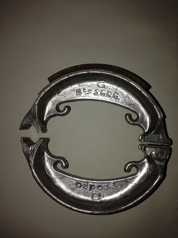 Quelques nouvelles du front : nouveaux pneus flancs blancs commandés, le lustrage de la peinture continue et grâce à la médaille j'ai pu retracer une partie de l'histoire du cyclo. Il a été offert par un monsieur à son épouse en 1964 . C'est lui qui a fabriqué la médaille dans l'usine où il travaillait à l'époque. J'ai aussi une question à propos des comodos: ils bougent un peu et je voulais savoir comment faire pour y remédier car je n'ai pas vu de vis permettant le serrage. Pour refaire les fonds de jantes j'ai acheté un rouleau d'adhésif dont la face externe est feutrée, d'après un ami qui court en ancienne c'est idéal.