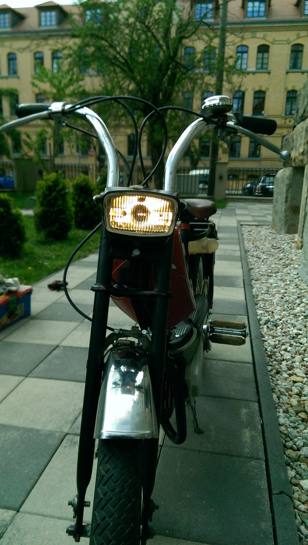 Fini fini... Les feux marchent et les carters moteurs sont installés. Il me faut d'aller chercher une plaquette d'immatriculation pour faire la ballade dans l'atelier qui prépare les fardes boues en bois. Maintenant elle a une garde boue avant acier, pas trop mal.